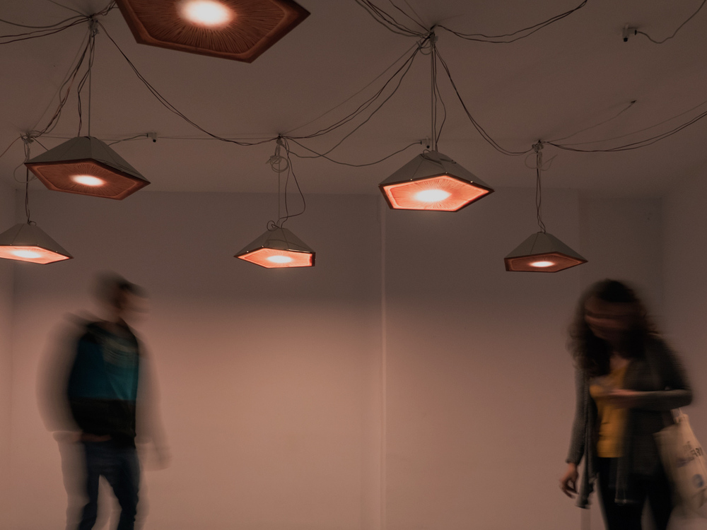 Fangai is an interactive installation structured as a light & sound experience. It starts with a light fixture, as a pentagonal mushroom, designed with a Sengled interactive wireless audio speaker incorporated in a light bulb. The installation consists of 12 mushrooms, each of them generating light and sounds.